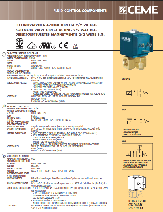 除第27頁一般特性中要求的所有其他值外,本值系列中支持的值被確定為可吸入氣體的截留值。型號通過了歐洲經濟共同體指令90/396(氣體及其部件的設備)(6609-6610-6611-6612)的型式認證,并符合第二個歐盟和161閥門的要求:除了一般特征或第27頁中指出的其他類型或介質,該系列閥門適用于截留或易燃氣體,已提交了EEC指令CEE 90/396(氣體裝置及其部件)(6609-6610-6611-6612)要求的特定型號進行試驗,并按照UNI和161的要求完成了A級閥門的要求。壽命:在27座外標識介質的一般特性,經專門測試可與詳細氣體一起使用。大多數建筑商根據歐洲經濟共同體指令90/396進行了測試,并接受了數十萬次完整性測試。特定類型(6609-6610-6611-6612)要測試是否符合歐盟和161,有一個指令。